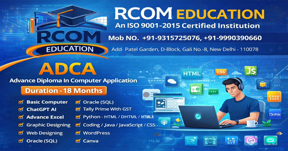 At RCOM EDUCATION, an ISO 9001:2015 Certified Institution, we offer a comprehensive ADCA (Advance Diploma in Computer Application) program designed to build strong computer fundamentals and advanced technical skills. This course is ideal for students, job seekers, and working professionals who want to build a successful career in the IT and digital field.